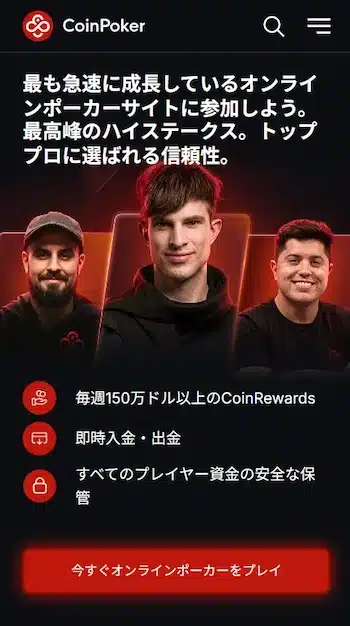 ライセンス アンジュアン ゲームの種類 テキサスホールデム / オマハ アプリ Windows / Mac OS / iOS / Android 決済手段 クレジットカード / 仮想通貨 日本語顧客サポート なし CoinPokerは、日本語で利用できる仮想通貨特化型のオンラインポーカーサイト。暗号資産決済に最適化することで、ストレスフリーな超高速入出金を実現。面倒な本人確認を一切不要とした徹底的な匿名性により、メールアドレスとパスワードのみで即座に世界中のプレイヤーと真剣勝負を開始できます。