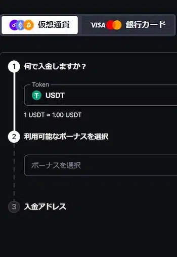 クレジットカード・電子ウォレット・仮想通貨など、各サイトが対応する決済方法で入金します。入金画面に進んだら、利用したい決済方法を選択、入金額を入力して入金手続きを完了させます。