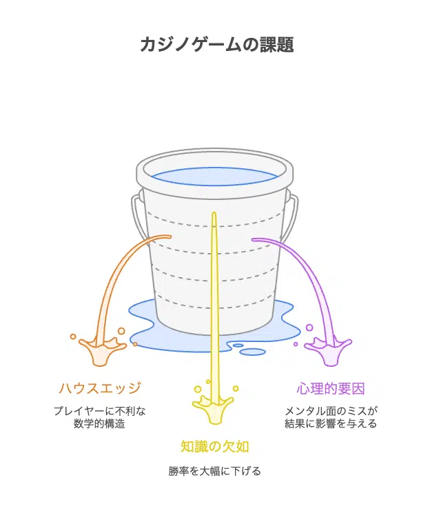 - ゲーム選択や知識不足:何も考えずに低ペイアウト率のゲームばかり選んでいたり、ルールを理解せず戦略なく遊んでいると、当然勝率は下がります。特に初心者の場合、ゲームごとの特性を知らずに損をしているケースも少なくありません。