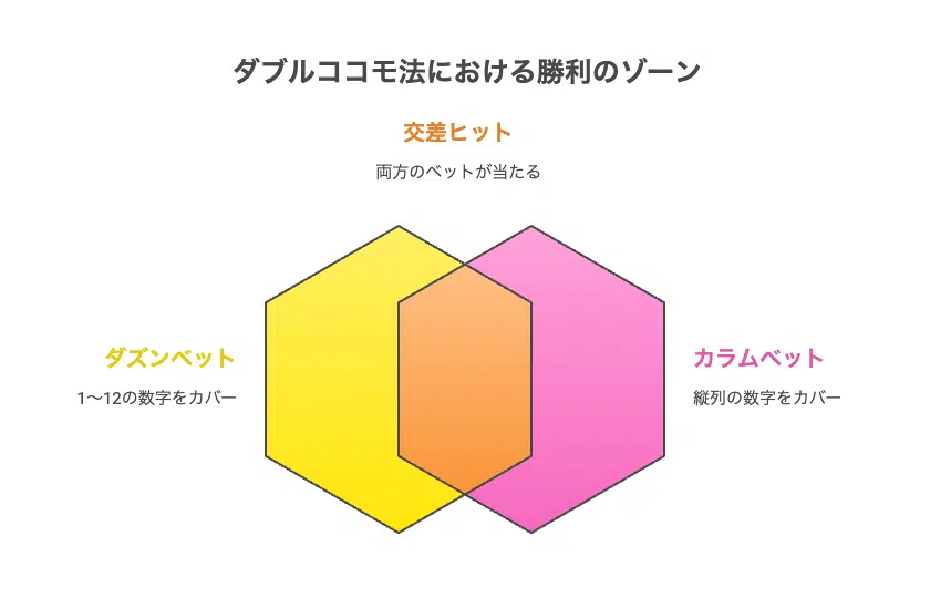 ダブルココモ法は、ルーレットで「ダズン(12数)」と「カラム(縦列)」の2か所に同時ベットし、負けたときは前2回の賭け額を足して増やす手法です。通常のココモ法を二手並行で回すイメージなので、当たり目が広くなり流れに乗りやすいことも。