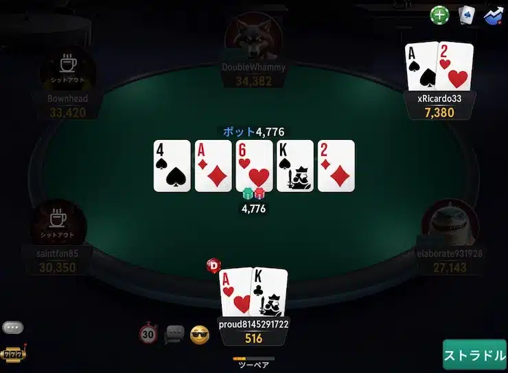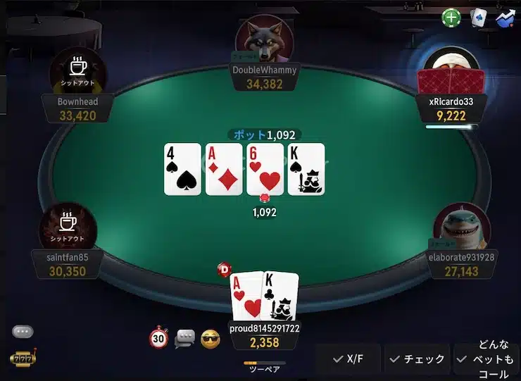 - 残ったプレイヤーが手札を公開し、最も強い役を作った人がポットを獲得する(ショーダウン)